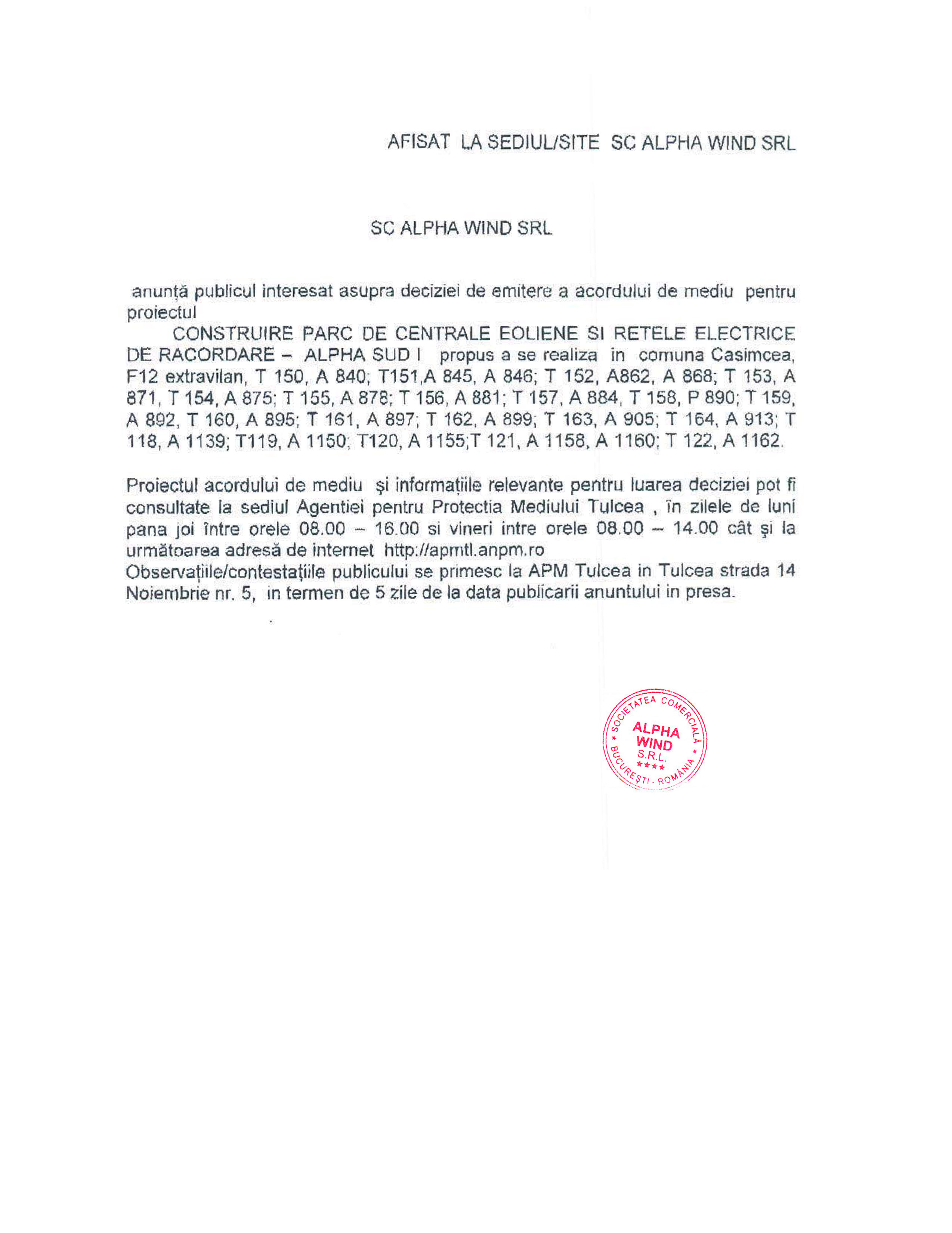 Alpha Wind Anunt Public - Dezbatere Publica emitere Acord de Mediu pentru Construire Parc de Turbine Eoliene si Retele Electrice de Racordare Nord III si Sud I.pdf