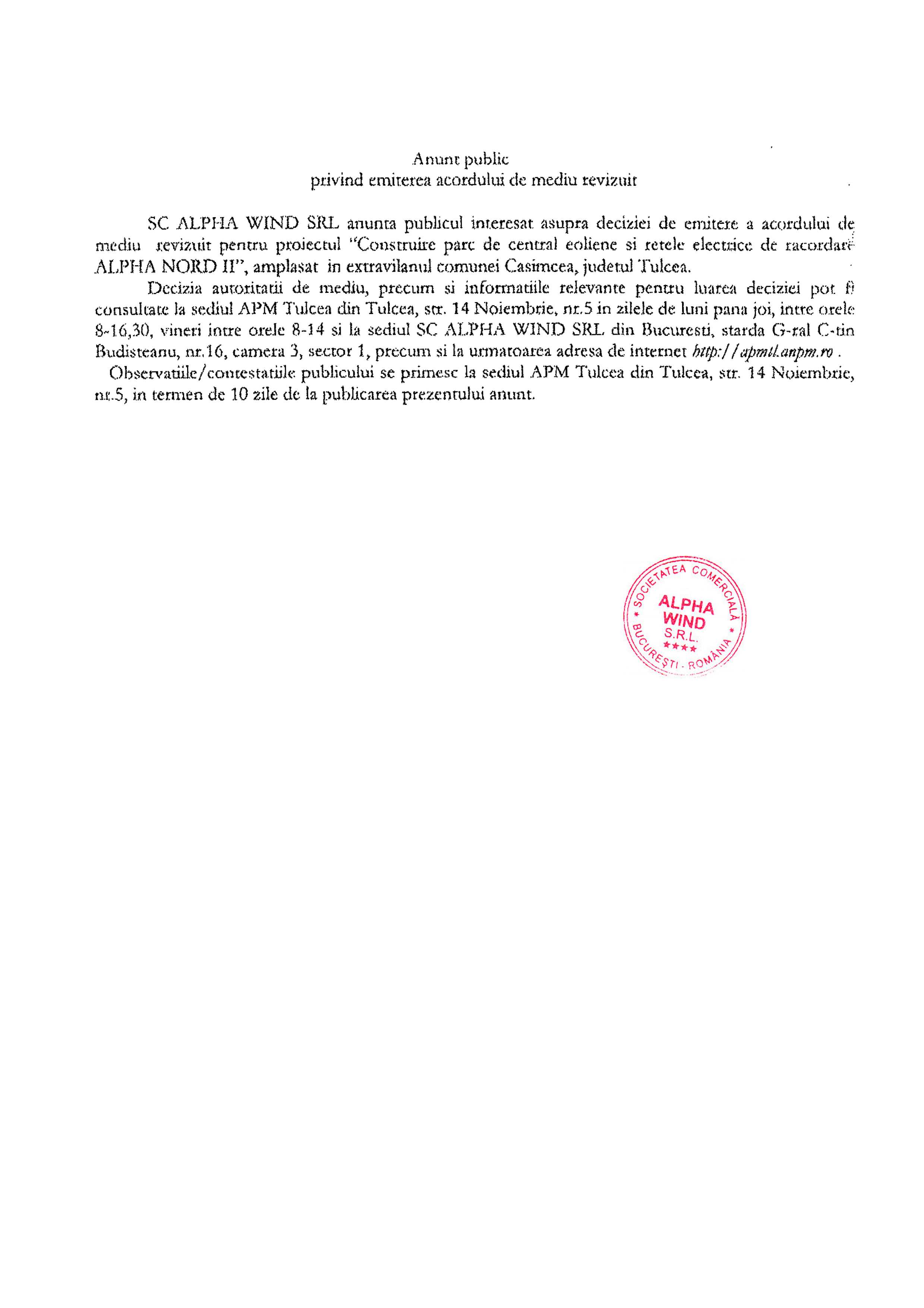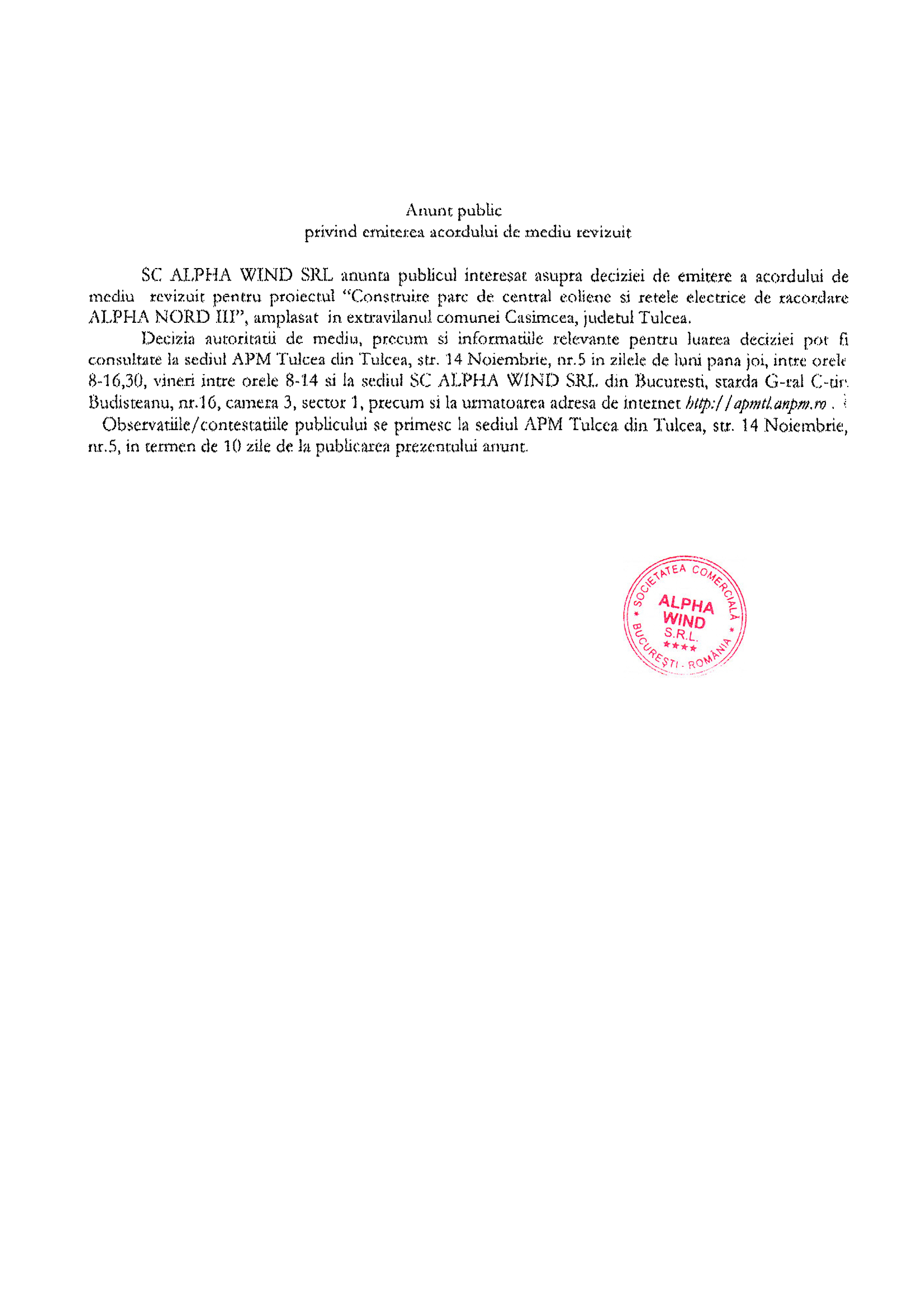 ALPHA WIND - Anunt Public Decizie APM Tulcea Emitere Acord Mediu proiect Parc de turbine eoliene si retele elctrice de racordare Nord I.pdf